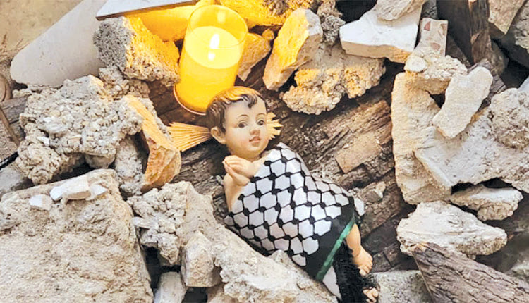 Πιο συγκεκριμένα, σε ένα ύψωμα από κομμάτια σκυροδέματος – υλικά απομεινάρια των ανελέητων βομβαρδισμών – που πλαισιώνουν ένα μικρό δέντρο ελιάς – αιώνιο σύμβολο ειρήνης – «είδαν» οι κάτοικοι της περιοχής τη φάτνη που ταιριάζει στη δική τους ζοφερή πραγματικότητα. Στο κέντρο αυτού του πέτρινου όγκου, τοποθέτησαν μια κούκλα, παραπέμποντας συμβολικά στον νεογέννητο Ιησού, αλλά και σε όλα τα μωρά που παγιδεύτηκαν και που συνεχίζουν να παγιδεύονται κάτω από τα χαλάσματα. Γύρω από τη φάτνη με τα μπάζα, οι άνθρωποι έχουν τοποθετήσει θρυμματισμένα κλαδιά δέντρων, κεριά και διάφορες εικόνες…Ο εφημέριος της Λουθηρανικής Εκκλησίας, Μουνθέρ Ισαάκ, με ανάρτηση του στα μέσα κοινωνικής δικτύωσης, γράφει: «Χριστούγεννα στην Παλαιστίνη φέτος. Το παιδί κάτω από τα ερείπια. Ο Θεός Εμμανουήλ είναι μαζί μας στον πόνο και τη δυστυχία μας. Ο Θεός είναι αλληλέγγυος με τους καταπιεσμένους. Το παιδί της Βηθλεέμ είναι η ελπίδα μας. Για τα παιδιά της Γάζας και για όλα τα θύματα των πολέμων. Δεν μπορούμε να γιορτάσουμε τη γέννηση του Ιησού Χριστού φέτος, ενώ διαπράττεται γενοκτονία εναντίον του λαού μας στη Γάζα. Δεν έχουμε διάθεση να γιορτάσουμε».