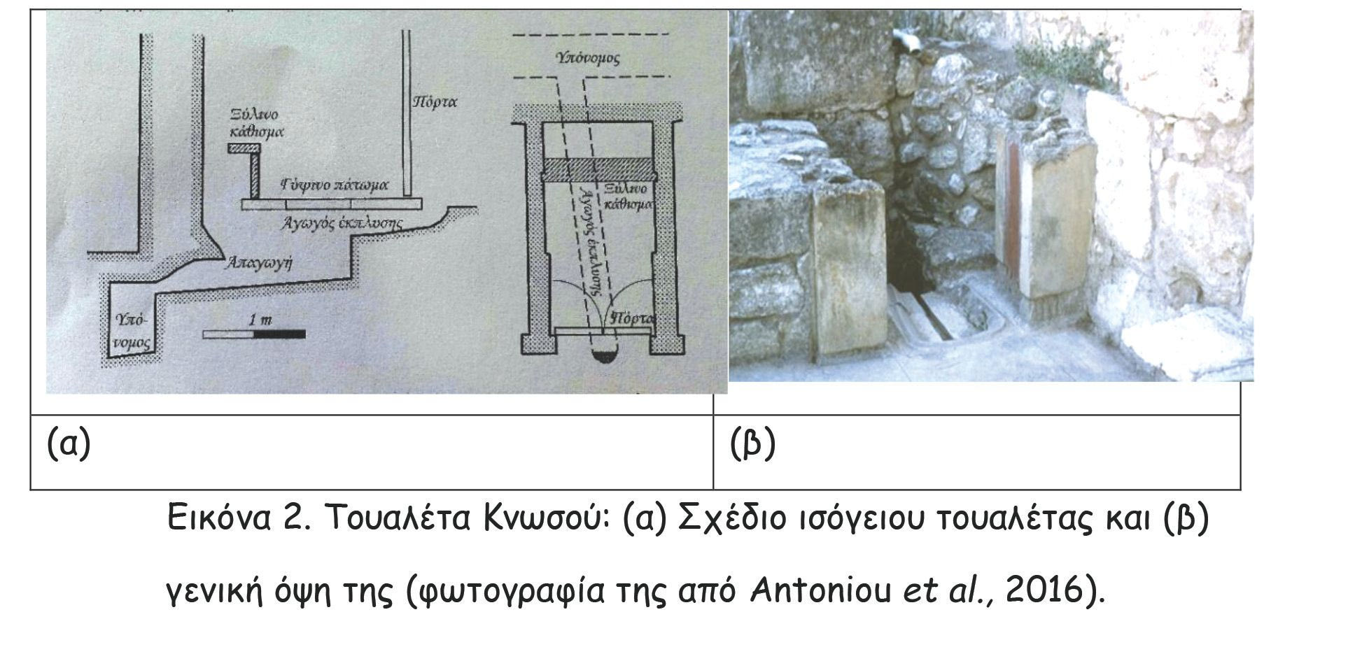 Ακόμη, αξιοσημείωτη είναι η πρώτη τουαλέτα με σύστημα απόπλυσης, που βρέθηκε σε λουτρό της Κνωσού και ομοιάζει με τον τύπο λουτρών, που βρέθηκαν στη Φαιστό και στα Μάλια. Στην τουαλέτα της Κνωσού, τμήματα πήλινων αγωγών, που βρέθηκαν λίγο έξω από την πόρτα του δωματίου, υποδηλώνουν ότι το νερό περνούσε μέσα από ένα μικρό κανάλι στο πάτωμα, που άρχιζε ακριβώς έξω από την πόρτα του λουτρού (Antoniou, et al., 2016). Ένας αγωγός κάτω από το πάτωμα συνέδεε το άνοιγμα με τον πήλινο αγωγό κάτω από τη λεκάνη (Εικ. 2). Αυτή η τουαλέτα της Κνωσού ήταν λειτουργική επί πολλούς αιώνας.