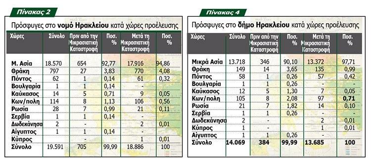 Ο πίνακας 4 δείχνει ότι η συντριπτική πλειονότητα των προσφύγων που απαντάται στον Δήμο Ηρακλείου, τόσο αυτοί που ήλθαν πριν τη Μικρασιατική Καταστροφή όσο και αυτοί που ήλθαν μετά από αυτήν, προέρχονταν από τη Μικρά Ασία.