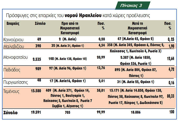 Τους στις επαρχίες του νομού Ηρακλείου πρόσφυγες κατά χώρες προέλευσης, με διάκριση των ελθόντων πριν Μικρασιατική Καταστροφή και μετά από αυτήν, δείχνει ο πίνακας 3.