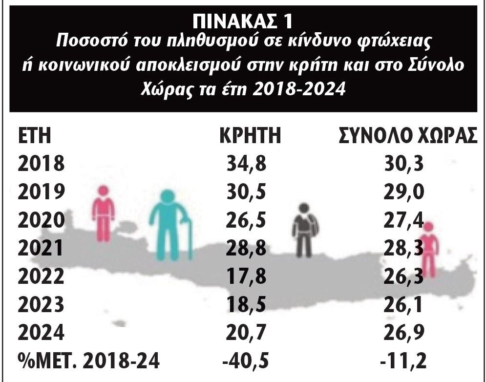 Από τον Πίνακα 1 φαίνεται ότι τα δύο πρώτα χρόνια της περιόδου 2018-2024, το ποσοστό του πληθυσμού σε κίνδυνο φτώχειας ή κοινωνικού αποκλεισμού στην Κρήτη ήταν υψηλότερο εκείνου στο Σύνολο Χώρας, το 2020 χαμηλότερο, το 2021 υψηλότερο και τα τρία τελευταία έτη πολύ χαμηλότερο, με αποτέλεσμα η μείωσή του στην Κρήτη το 2024, σε σχέση με το 2018, να είναι σχεδόν τετραπλάσια εκείνης στο Σύνολο Χώρας.