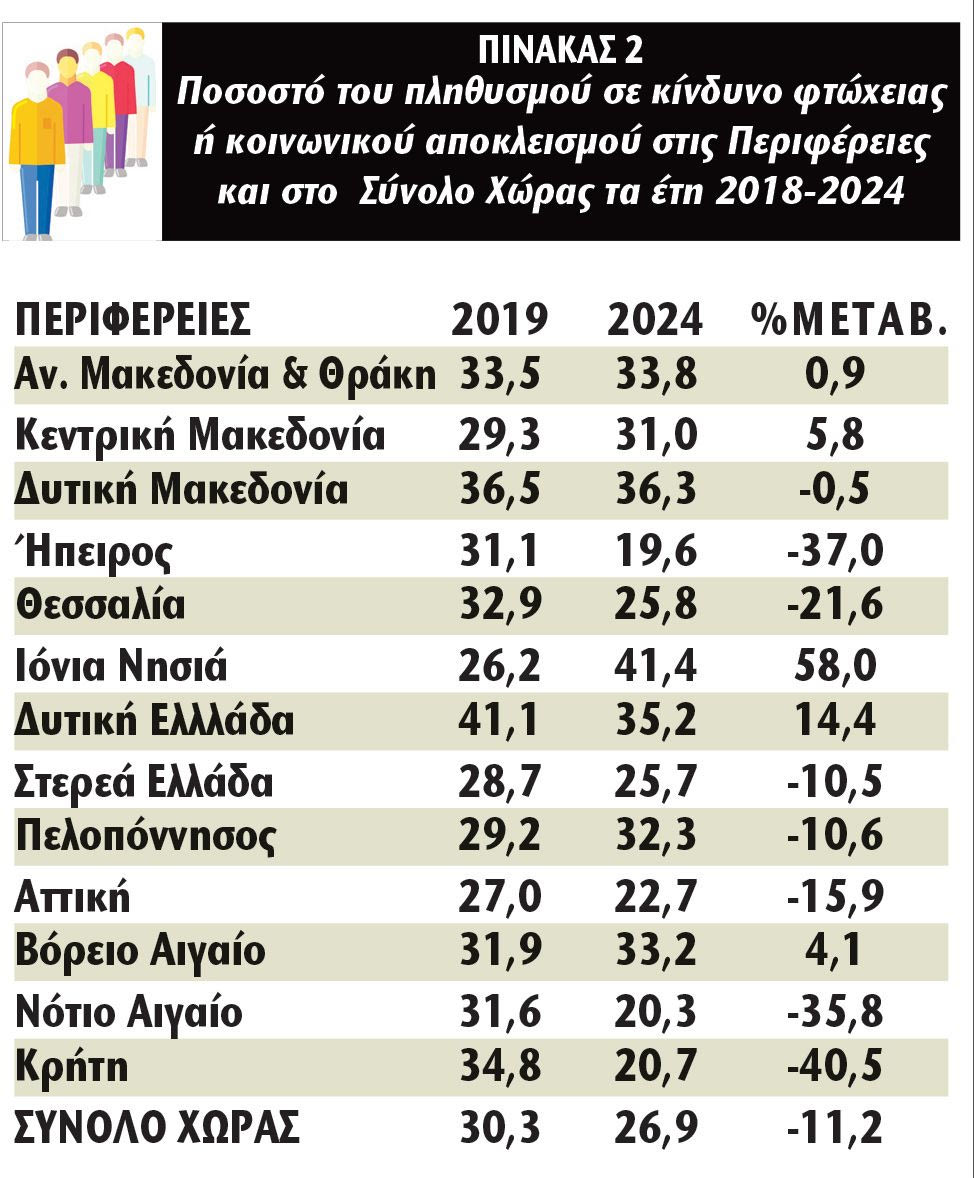 -Σε 8 περιφέρειες μειώθηκε το ποσοστό του πληθυσμού σε κίνδυνο φτώχειας ή κοινωνικού αποκλεισμού και σε 5 αυξήθηκε.