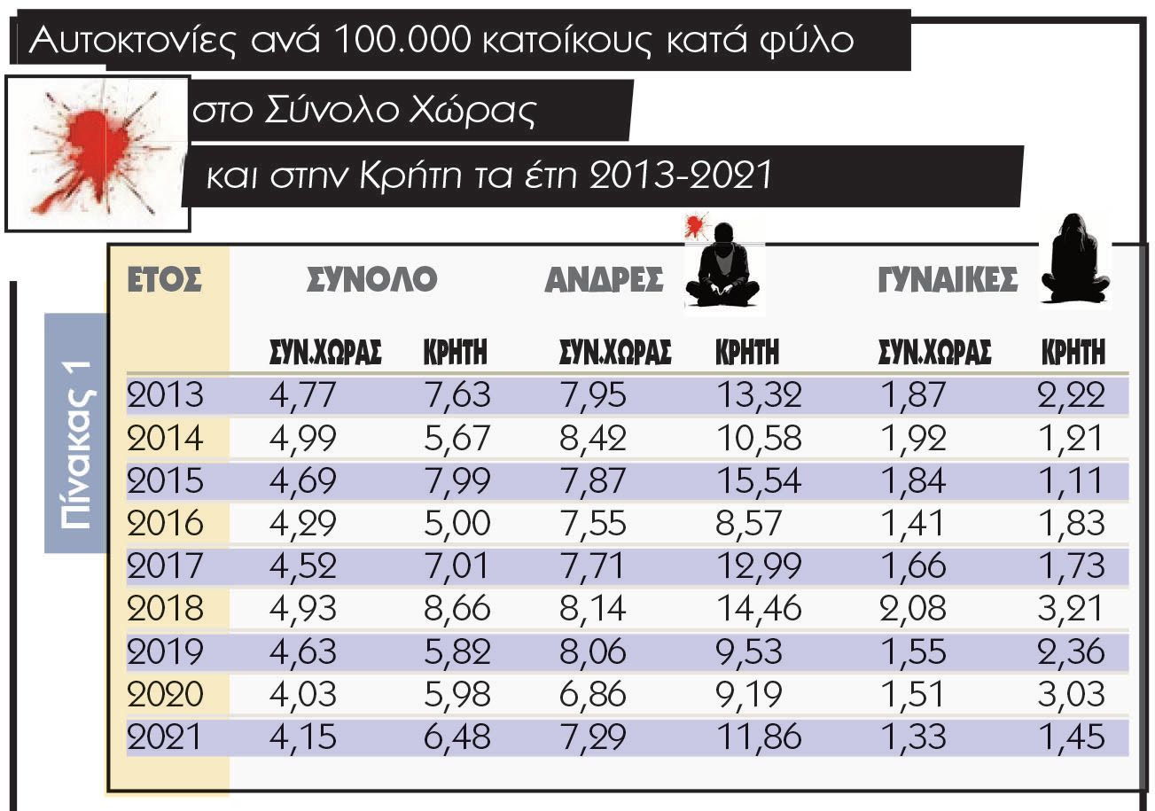 Στις δύο πρώτες στήλες του Πίνακα 1 δίνονται οι αυτοκτονίες ανά 100.000 κατοίκους για το σύνολο (άνδρες και γυναίκες μαζί) στο Σύνολο Χώρας και στην Κρήτη τα έτη 2013-2021, στις δύο επόμενες για τους άνδρες και στις δύο τελευταίες για τις γυναίκες.