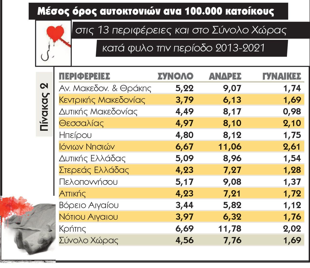 Σε όλες τις περιφέρειες ο αριθμός των αυτοκτονιών ανά 100.000 στους άνδρες ήταν μεγαλύτερος από εκείνο των γυναικών. Υπάρχουν, όμως, πολύ μεγάλες διαφορές ανάμεσα στις περιφέρειες.