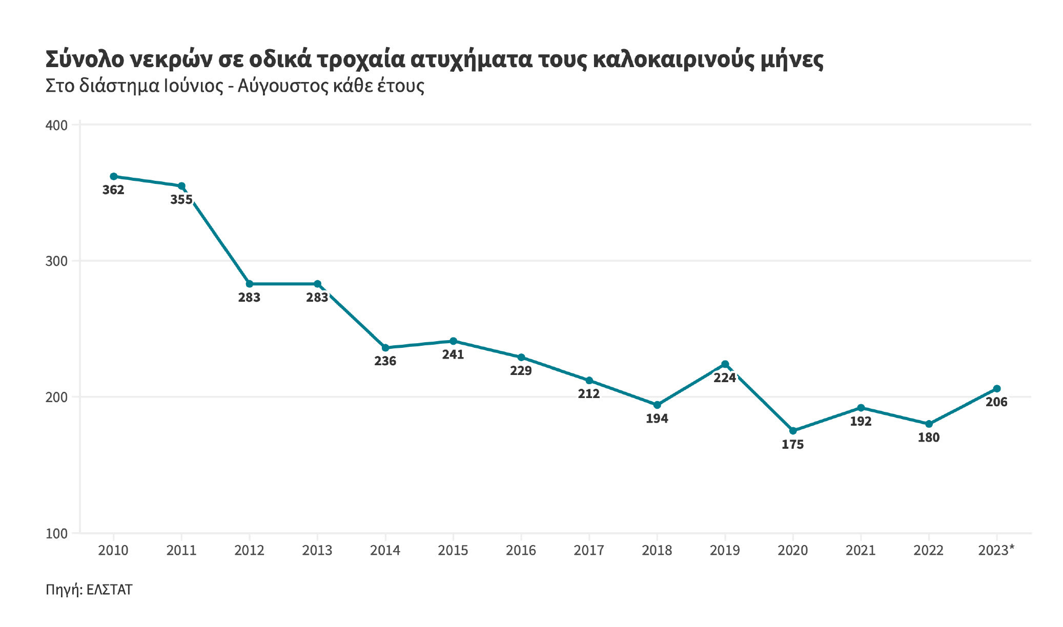 Οι καλοκαιρινοί μήνες είναι οι πιο «αιματηροί» στους ελληνικούς δρόμους, εδώ και πολλά χρόνια. Αν και από την περασμένη δεκαετία η κατάσταση έχει βελτιωθεί σημαντικά, με το σύνολο των θανάτων να μειώνεται από το υψηλό των 362 το καλοκαίρι του 2010, στους 206 το καλοκαίρι του 2023, είναι η δεύτερη φορά τα τελευταία έξι χρόνια (από το 2018) που οι νεκροί ξεπέρασαν τους 200.