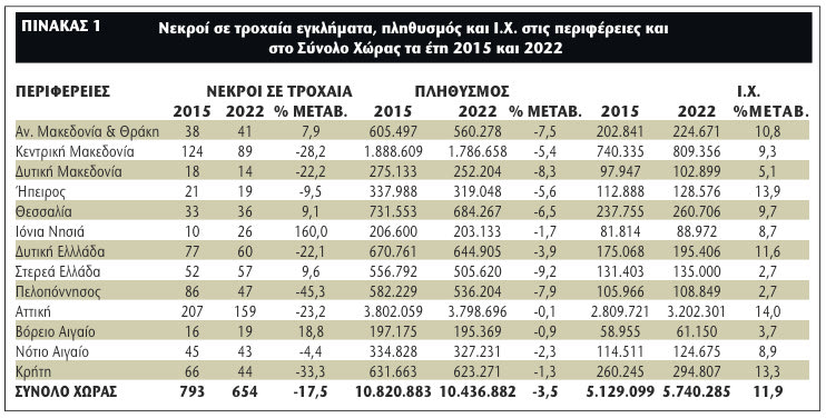 Στις δύο πρώτες στήλες του Πίνακα 1 δίνονται οι νεκροί από τροχαία στις περιφέρειες και στο Σύνολο Χώρας τα έτη 2015 και 2022 και στην 3η η ποσοστιαία μεταβολή τους, στις 3 επόμενες ο πληθυσμός και στις τρεις τελευταίες τα Ι.Χ..