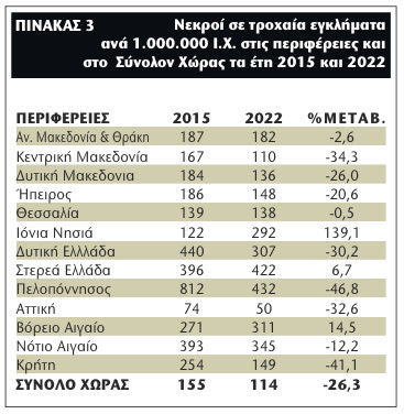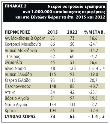 Από την 3η στήλη του Πίνακα 2 φαίνεται ότι το 2022 σε σχέση με το 2015 σε 8 περιφέρειες σημειώθηκε μείωση στους νεκρούς σε τροχαία ανά 1.000.000 κατοίκους και σε 5 αύξησή τους.