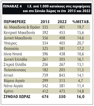 Από την 3η στήλη του Πίνακα 4 φαίνεται ότι το 2022 σε σχέση με το 2015 σε όλες τις περιφέρειες σημειώθηκε αύξηση στα Ι.Χ. ανά 1.000 κατοίκους.