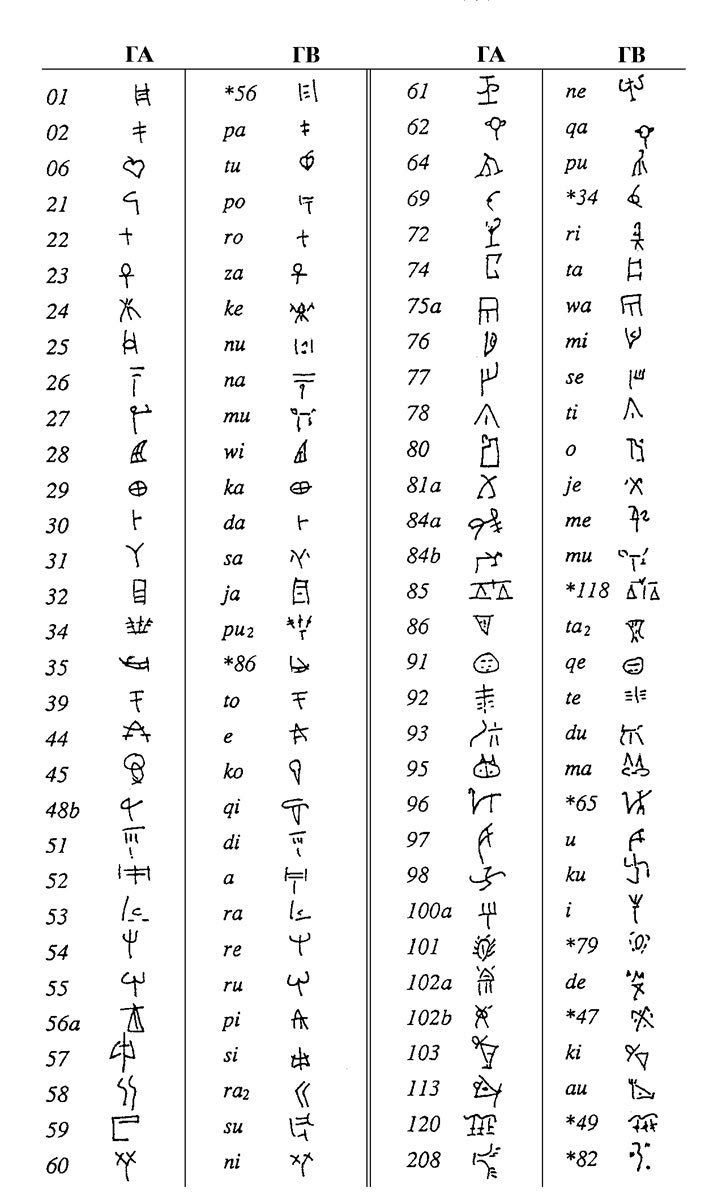 – Όπου έβαλα διαχωριστική γραμμή, το σχήμα του χαρακτήρα αυτού δεν είναι εφικτό να ταυτοποιηθεί απόλυτα βάσει της λίστας Duhoux και εικάζεται ότι αποδίδει έναν από τους διαζευκτικά προτεινόμενους φθόγγους.