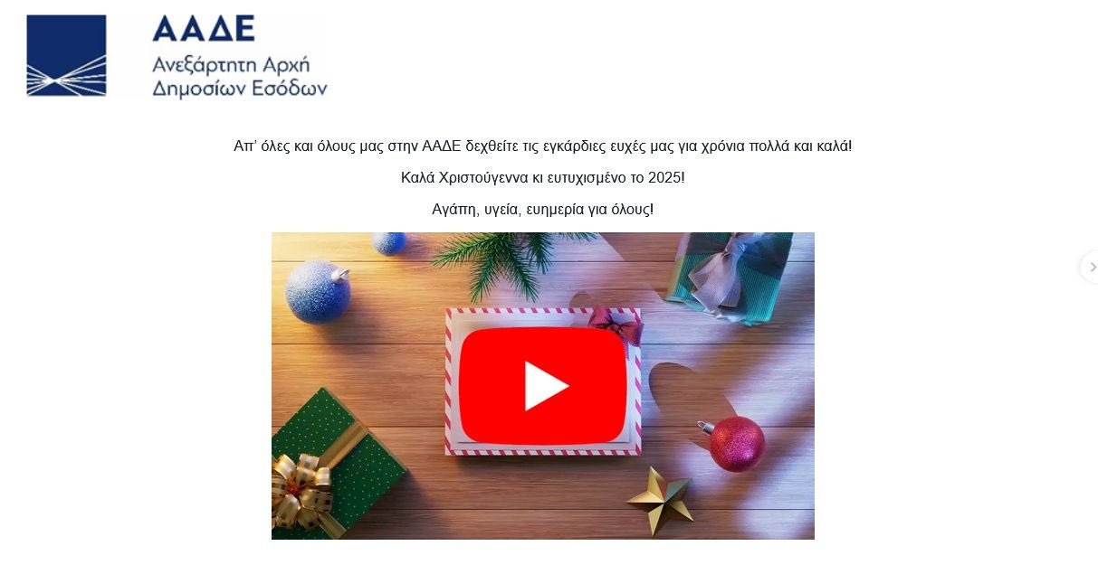 «Καλά Χριστούγεννα κι ευτυχισμένο το 2025!», τονίζουν από την ΑΑΔΕ και συνεχίζουν: «Αγάπη, υγεία, ευημερία για όλους!».