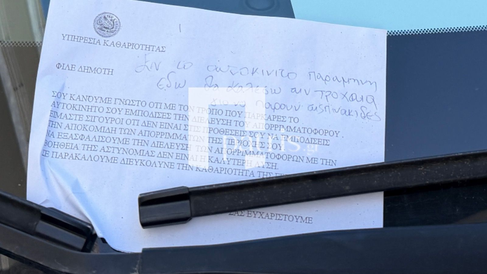 Οδηγός πολυτελούς οχήματος ενώ γνώριζε ότι εμποδίζει το απορριμματοφόρο, παρόλα αυτά το πάρκαρε, ζητώντας με γραπτό μήνυμα που άφησε στο ταμπλό του οχήματος του, να τον καλέσουν οι υπάλληλοι της καθαριότητας για το βγάλει!!!