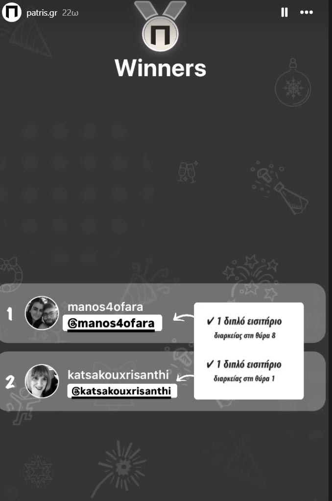 Ο μεγάλος διαγωνισμός ολοκληρώθηκε, οι νικητές ανακοινώθηκαν όπως βλέπετε στο προφίλ του Instagram του patris.gr και ήδη τα προφίλ που στάθηκαν… τυχερά @katsakouxrisanthi και @manos4ofara, έχουν ειδοποιηθεί για τον τρόπο παραλαβής των εισιτηρίων.