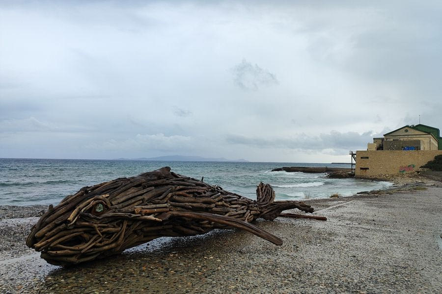 Σε ένα από τα σημεία που είχαν φτιαχτεί στην παραλιακή ως χώροι ανάπαυσης με παγκάκια, δίπλα στο Μουσείο Φυσικής Ιστορίας, στέκονται δύο όμορφα ξύλινα γλυπτά.
