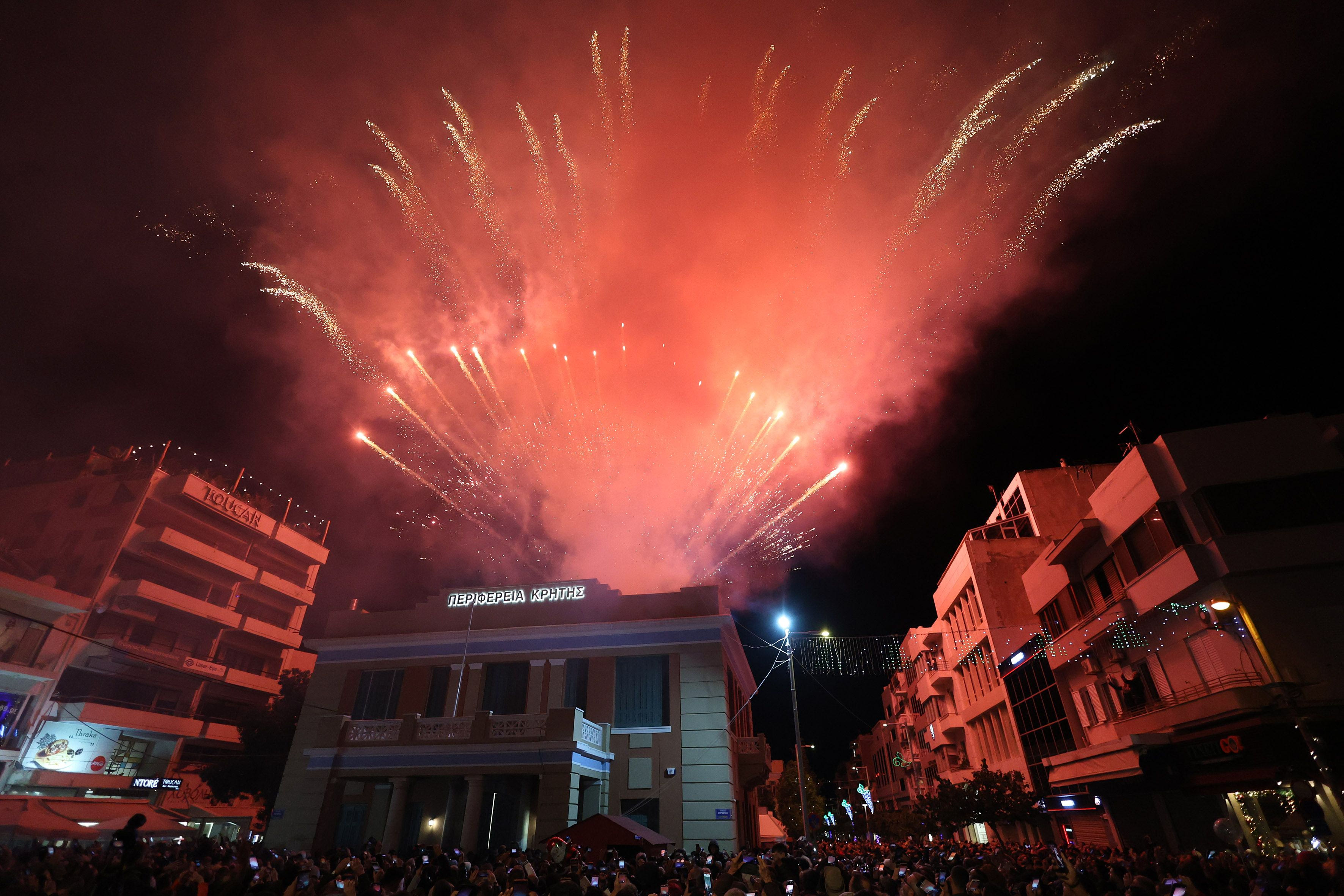 Ο ουρανός φωτίστηκε από πυροτεχνήματα, πάνω από το κτίριο της Περιφέρειας, πλήθος κόσμου είχε μαζευτεί από νωρίς ενώ ο Δήμαρχος Ηρακλείου Αλέξης Καλοκαιρινός μετά λίγα δευτερόλεπτα μετά τις 00.00 ευχήθηκε για μια δημιουργική χρονιά.