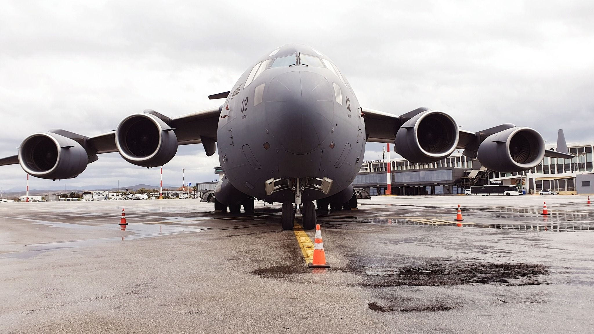 Πρόκειται για το C-5 Galaxy της US Air Force, το οποίο εντυπωσίασε όσους το είδαν από κοντά στην πίστα του αερολιμένα. Το αεροσκάφος ήρθε από το Ιρακ χθες, μετέφερε περίπου 50 στρατιώτες και αναχώρησε σήμερα, πιθανόν για Ολλανδία.