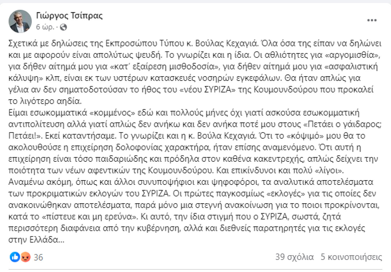 Εξίσου εντόνη ήταν και η επίθεση που εξαπέλυσε ο Γιώργος Τσίπρας κατά της κυρίας Κεχαγιά και με ανάρτησή του στο Facebook το βράδυ της Πέμπτης στην οποία έκανε λόγο για «αθλιότητες νοσηρών εγκεφάλων οι οποίες όπως τόνισε προκαλούν αηδία.