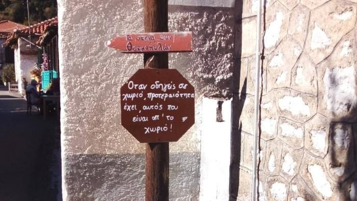 Παράλληλα, δυναμική παρουσία φαίνεται πως έχει και μία ακόμα πινακίδα που γράφει «όταν οδηγείς σε χωριό, προτεραιότητα έχει αυτός που είναι από το χωριό».