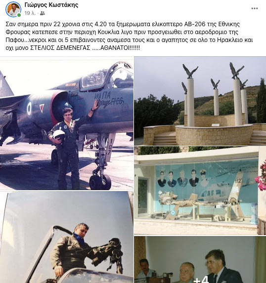 Σαν σήμερα ήταν πριν 22χρονια στις 4.20 τα ξημερώματα όταν ελικόπτερο ΑΒ-206 της Εθνικής Φρουράς κατέπεσε στην περιοχή Κούκλια λίγο πριν προσγειωθεί στο αεροδρόμιο της Πάφου…Νεκροί ήταν και οι πέντε επιβαίνοντες , ανάμεσά τους και ο αγαπητός στην Κρήτη που είχε υπηρετήσει χρόνια, Στέλιος Δεμέναγας.