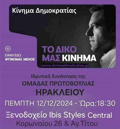 Ανακοινώθηκε η ιδρυτική συνάντηση της Ομάδας Πρωτοβουλίας Ηρακλείου του νέου κόμματος «Κίνημα Δημοκρατίας» του Στέφανου Κασσελάκη στο Ηράκλειο.
