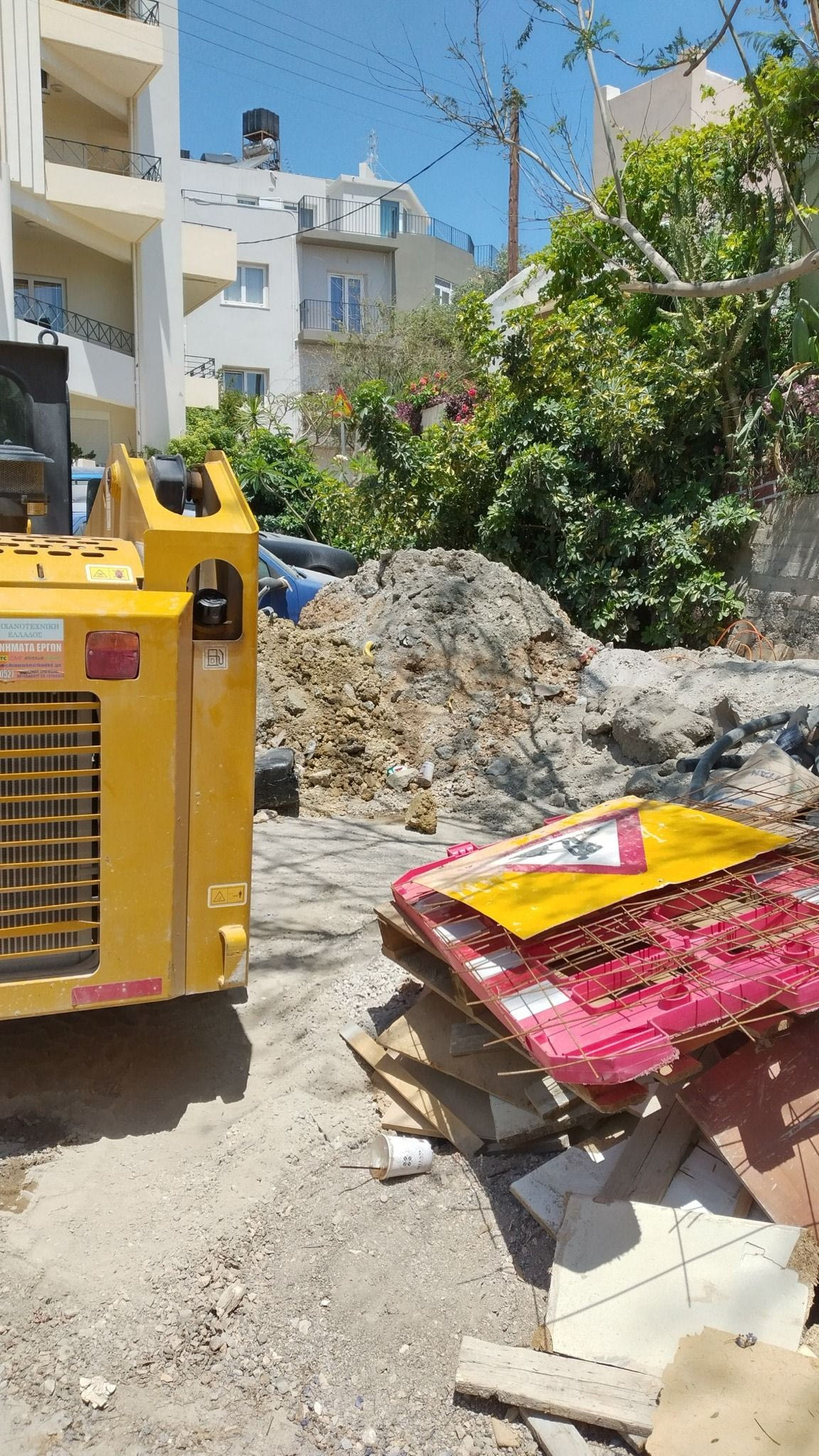 Παρατημένα μηχανήματα και χώματα από εργολάβους για ένα τουλάχιστον δίμηνο στην οδό Τίτου Γεωργιάδη και Ισιδώρου, εμποδίζουν τη φροντίδα των δέντρων, όπως καταγγέλουν οι κάτοικοι της περιοχής.