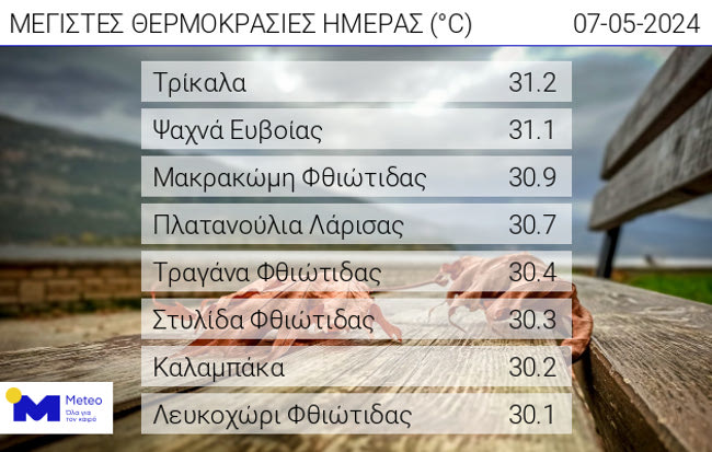 Στον παρακάτω πίνακα παρουσιάζονται οι 8 σταθμοί του δικτύου αυτόματων μετεωρολογικών σταθμών του meteo.gr / Εθνικού Αστεροσκοπείου Αθηνών που κατέγραψαν τις υψηλότερες θερμοκρασίες σήμερα, Τρίτη 07/05.