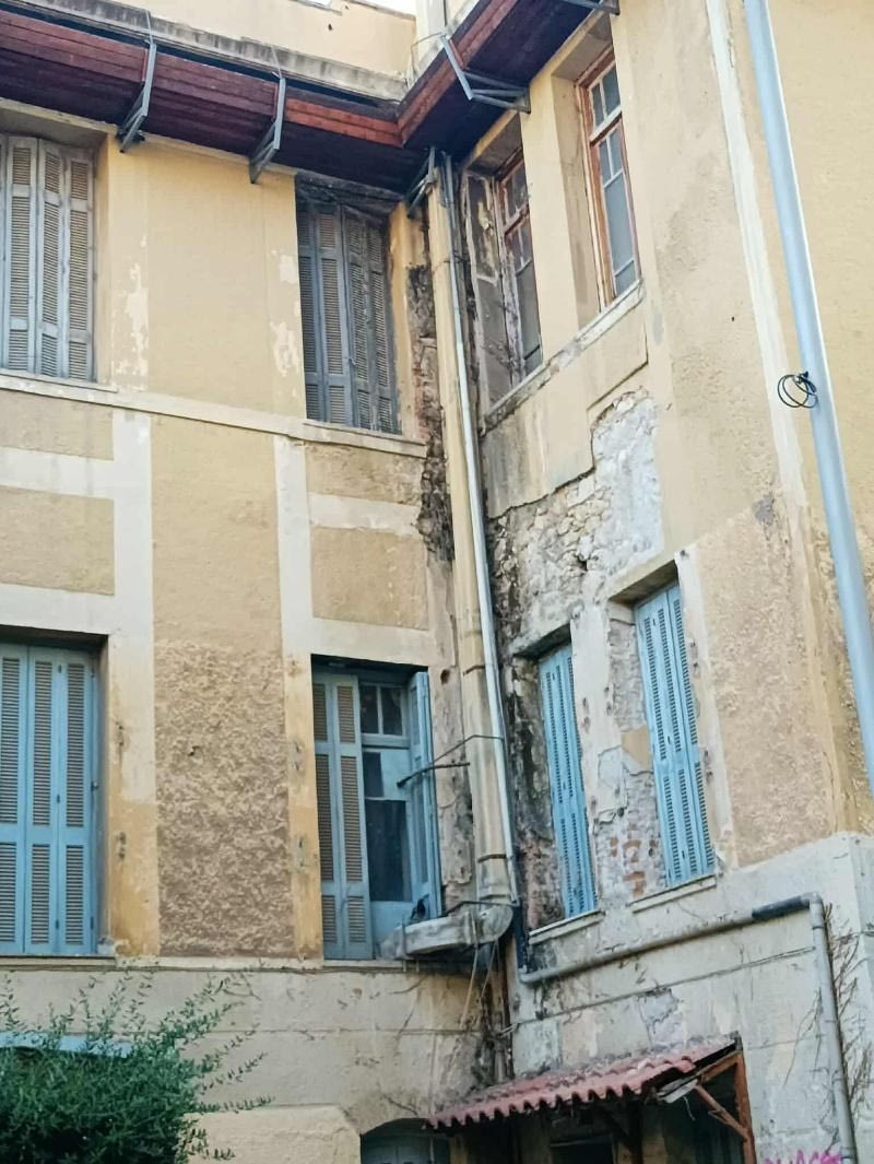 Οι φθορές είναι ορατές με πεσμένους όχι μόνο σοβάδες αλλά και τμήματα του κτιρίου ενώ ότι απομένει είναι γεμάτο με συνθήματα.