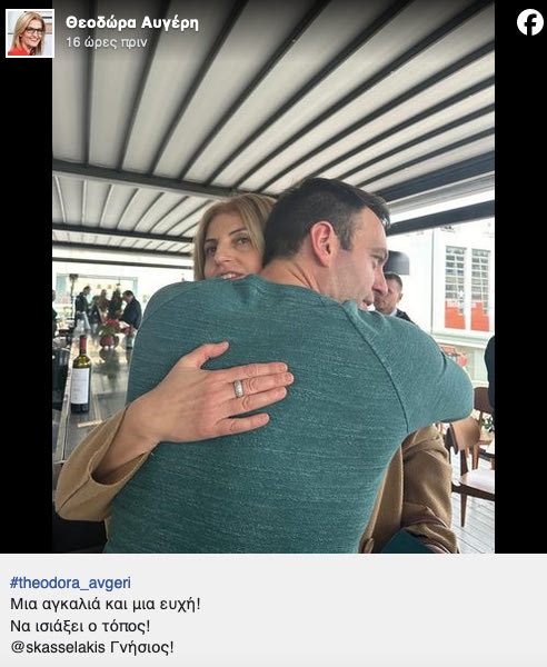 «Μια αγκαλιά και μια ευχή! Να ισιάξει ο τόπος!» σημείωσε η εκπρόσωπος Τύπου του ΣΥΡΙΖΑ – ΠΣ και τάγκαρε τον Στέφανο Κασσελάκη γράφοντας: «Γνήσιος!».