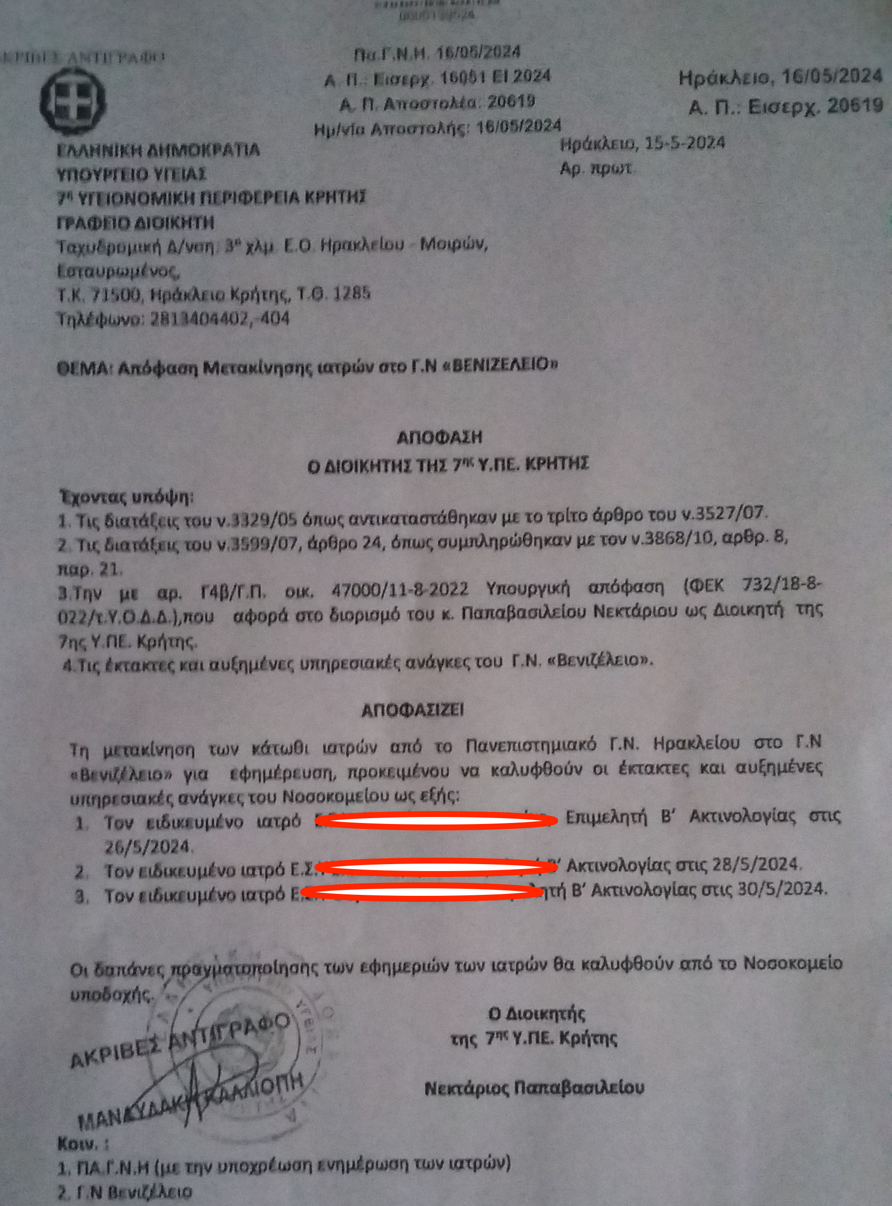Στο ίδιο έργο θεατές και τον Μάιο! Νέα “εντέλλεσθε” εστάλησαν σε ακτινολόγους του ΠΑΓΝΗ να καλύψουν εφημερίες του καταρρέοντος Βενιζελείου Νοσκομείου. Να υπενθυμίσουμε πως κάθε ακτινολόγος του ΠΑΓΝΗ που εφημερεύει το προηγούμενο βράδυ στο Βενιζέλειο θα πάρει ρεπό την επόμενη (ή κάποια μέρα μέσα στη βδομάδα), επομένως οι εξετάσεις του πρωινού τακτικού του προγράμματος για την ημέρα που θα πάρει το νόμιμο ρεπό, ακυρώνονται…