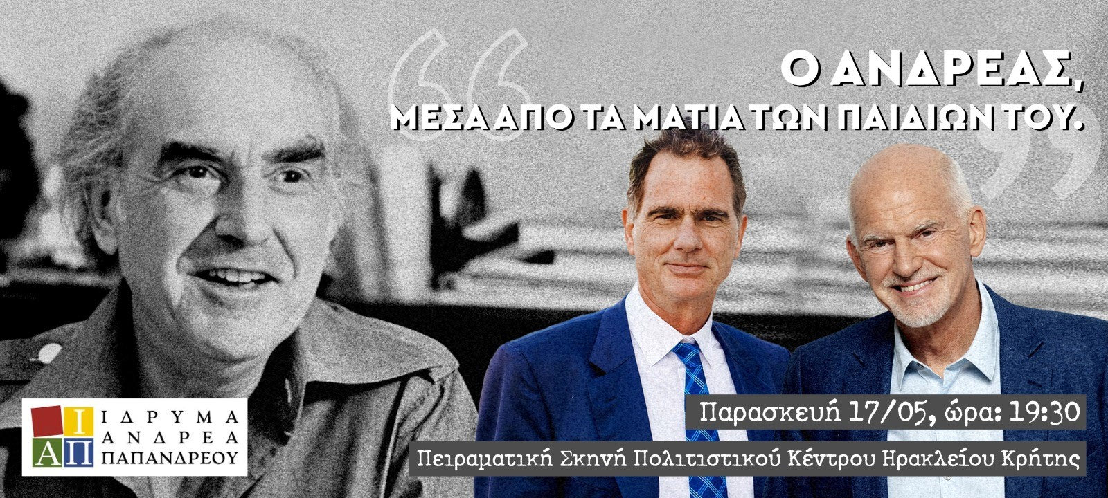 Ένα ταξίδι στον χρόνο και μαζί στην πολυσχιδή προσωπικότητα του Ανδρέα Παπανδρέου, του μεγάλου πολιτικού ηγέτη που σφράγισε με την προσωπικότητα του τη σύγχρονη ιστορία του τόπου, θα έχουν την ευκαιρία να κάνουν όσοι βρεθούν στην εκδήλωση με θέμα «Ο Ανδρέας μέσα από τα μάτια των παιδιών του», που διοργανώνει το Ίδρυμα Ανδρέα Παπανδρέου , την Παρασκευή 17 Μαΐου 2024, στις 19:30, στο Πολιτιστικό – Συνεδριακό Κέντρο (αίθουσα Πειραματική Σκηνή) στο Ηράκλειο Κρήτης .
