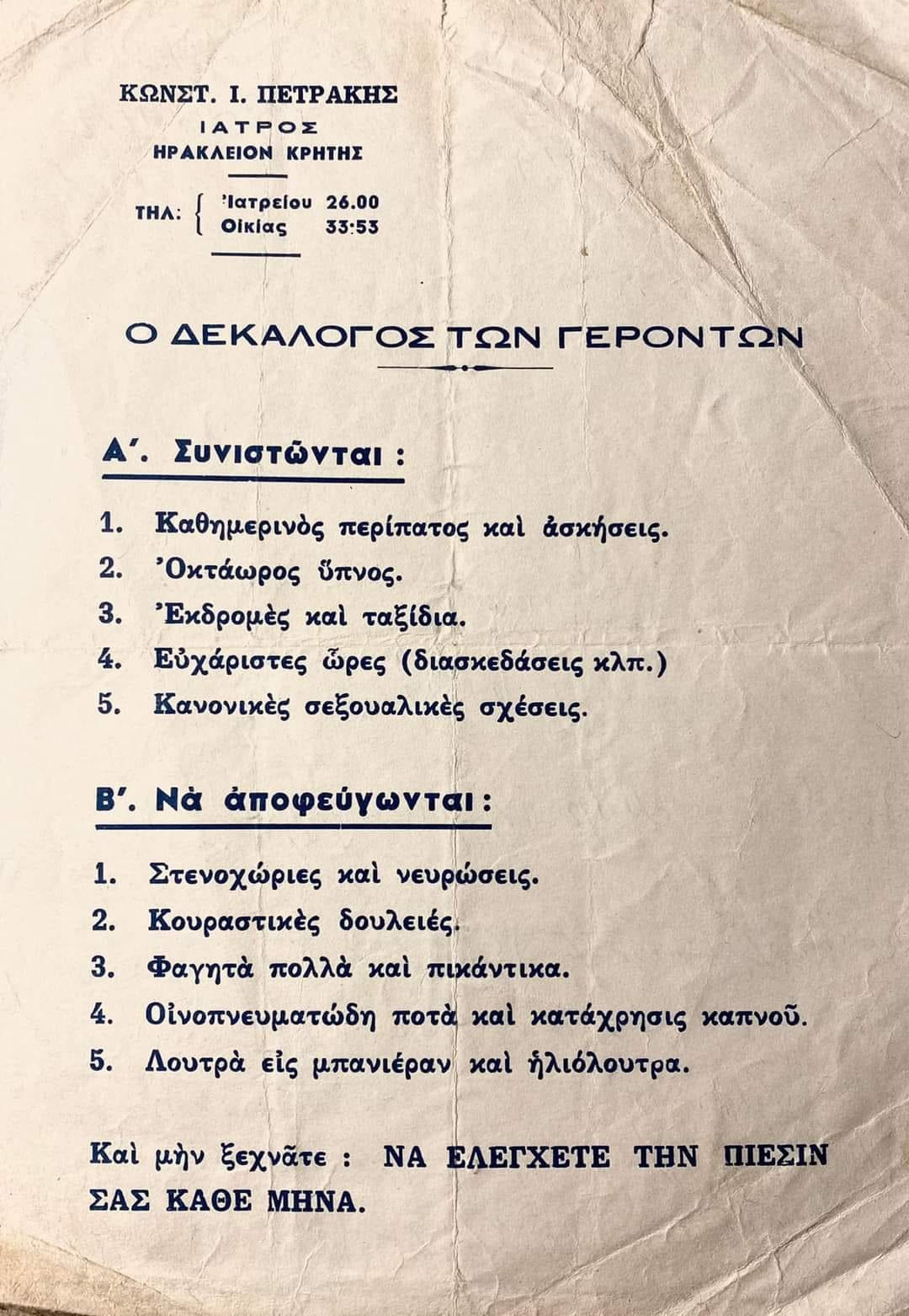 Αν κρίνουμε από τα τετραψήφια νούμερα τηλεφώνου, οι γραπτές οδηγίες του γιατρού Κ.Ι.Πετράκη ,υπό μορφή φυλλαδίου, με τον τίτλο «Ο δεκάλογος των γερόντων» πρέπει να δόθηκαν τις δεκαετίες 1950-1960.