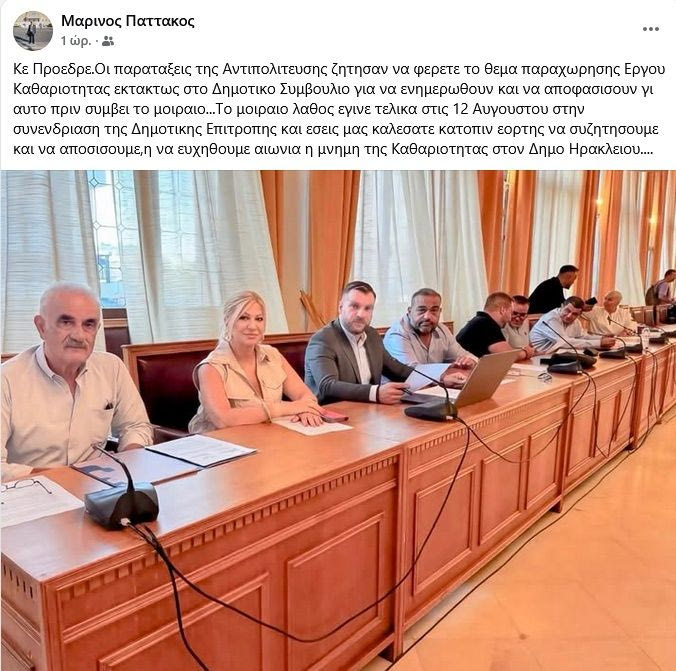 «Κε Προεδρε.Οι παραταξεις της Αντιπολιτευσης ζητησαν να φερετε το θεμα παραχωρησης Εργου Καθαριοτητας εκτακτως στο Δημοτικο Συμβουλιο για να ενημερωθουν και να αποφασισουν γι αυτο πριν συμβει το μοιραιο…Το μοιραιο λαθος εγινε τελικα στις 12 Αυγουστου στην συνενδριαση της Δημοτικης Επιτροπης και εσεις μας καλεσατε κατοπιν εορτης να συζητησουμε και να αποσισουμε, η να ευχηθουμε αιωνια η μνημη της Καθαριοτητας στον Δημο Ηρακλειου….»