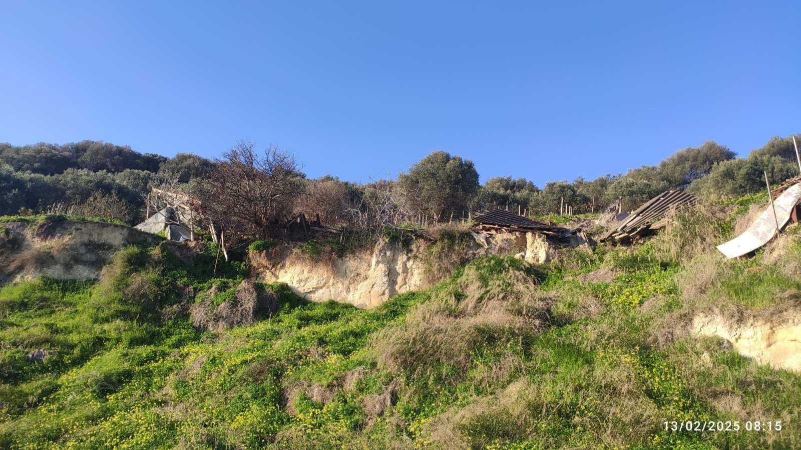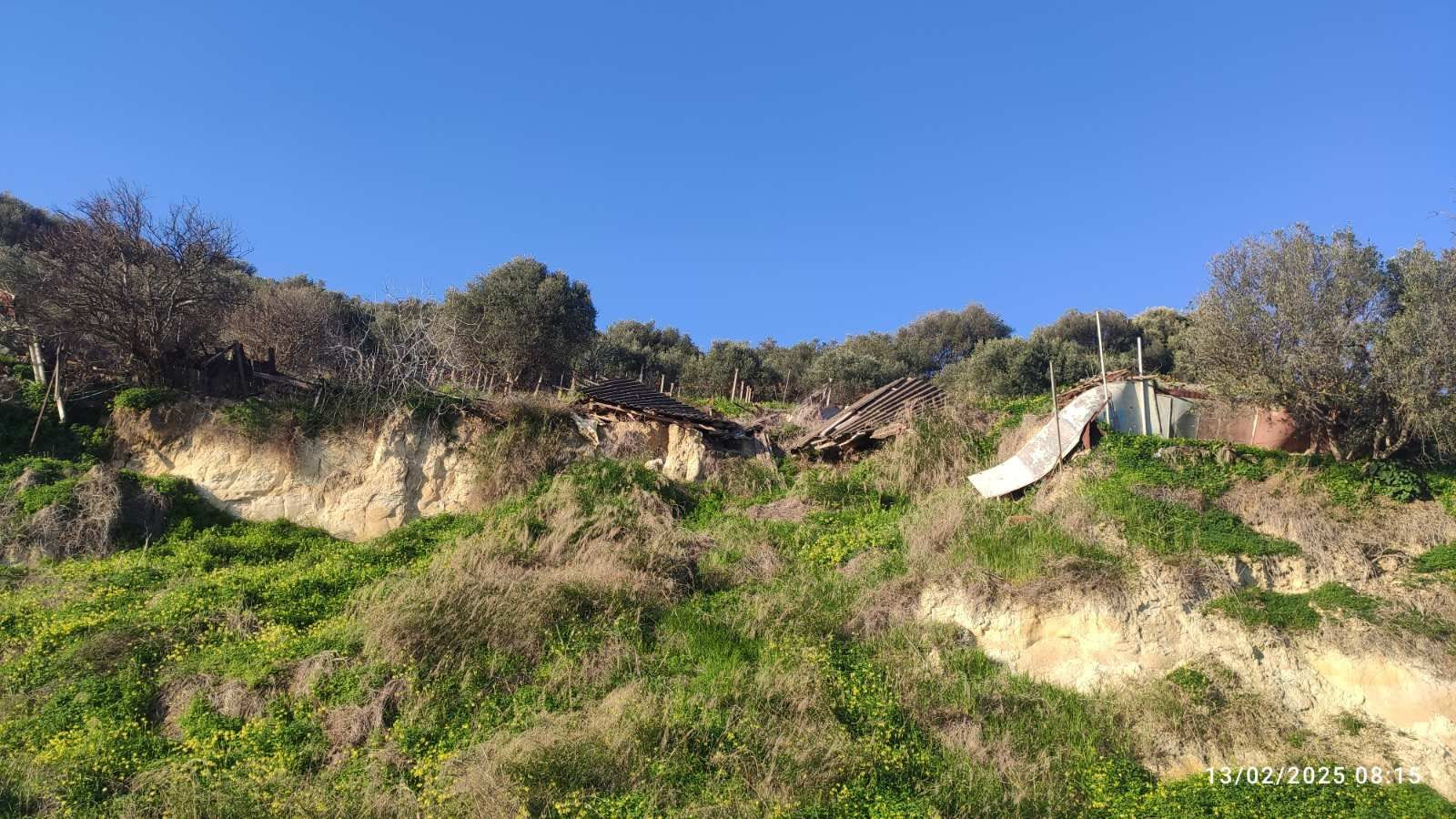 Η πρόχειρη αυτή αποθήκη που ήταν κατασκευασμένη από λαμαρίνες και κόντρα πλακέ, έχει διαλυθεί. Σανίδες, λαμαρίνες και σύρματα κρέμονται κυριολεκτικά από μια κλωστή.