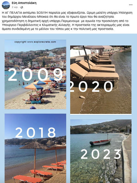 ΣΟΣ εκπέμπει η παραλία της Αγίας Πελαγίας στο Ηράκλειο! Σιγά σιγά εξαφανίζεται όπως δείχνουν οι φωτογραφίες των τελευταίων ετών. Μάλιστα η πρώην δημοτική σύμβουλος κ.Εύη Αποστολάκη ανέβασε χαρακτηριστικές εικόνες κάνοντας έκκληση στον δήμαρχο να μεριμνήσει να προστατευθεί η μοναδική αυτή περιοχή! Και επισημαίνει ότι υπάρχει ώριμη μελέτη!