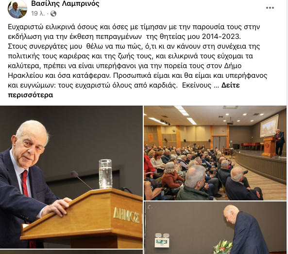 Και μετά τον χθεσινό απολογισμό οι ευχαριστίες! Ο Βασίλης Λαμπρινός αποχωρώντας από τον δήμο Ηρακλείου έκανε μία δημόσια ανάρτηση με ευχαριστίες και με μερικές δηκτικές αναφορές αποφεύγοντας πάντως να πει ποιοι τον στενοχώρησαν που δεν ήταν παρόντες στον απολογισμό του.