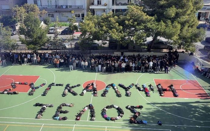 Συγκεκριμένα οι μαθητές του 3ου Γενικού Λυκείου Ηρακλείου σχημάτισαν με τις σχολικές τους τσάντες τη φράση «συγκάλυψη τέλος», στέλνοντας με αυτό τον τρόπο το δικό τους μήνυμα για δικαιοσύνη.