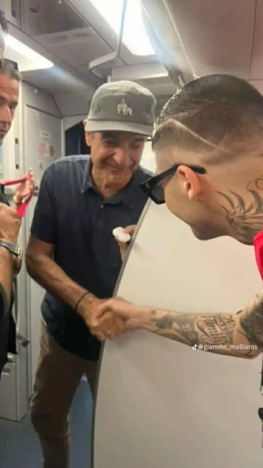 Η στιγμή αποθανατίστηκε από επιβάτη της πτήσης, με τη φωτογραφία να κάνει ήδη τον γύρο των social media. Δεν είναι γνωστό αν οι δύο άνδρες είχαν ευκαιρία για εκτενέστερη συζήτηση κατά τη διάρκεια του ταξιδιού.