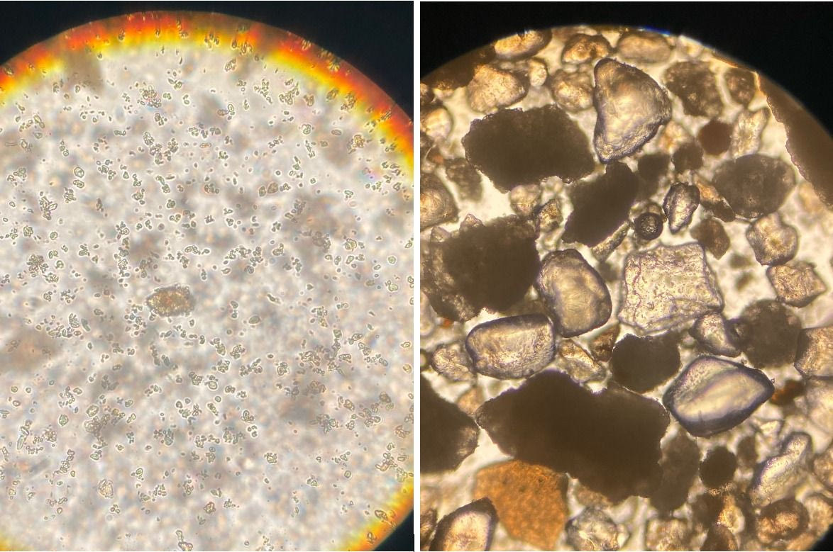 Στη δεύτερη του ανάρτηση ο κ. Παραγκαμιάν πόσταρε μια φωτογραφία και έγραψε: Για να γίνει αντιληπτή η διαφορά μεγέθους. Αριστερά Αφρικανική σκόνη από Ηράκλειο και δεξιά λεπτόκκοκη άμμος από Σαχάρα (Λιβύη). Δύο εικόνες σημερινές από φωτονικό μικροσκόπιο σε μεγέθυνση 125 φορές.