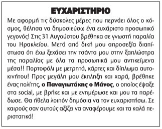 Με αφορμή τις δύσκολες μέρες που περνάει όλος ο κόσμος, θέλησα να δημοσιεύσω ένα ευχάριστο προσωπικό γεγονός! Στις 31 Αυγούστου βρέθηκα σε γνωστή παραλία του Ηρακλείου. Μετά από δική μου απροσεξία διαπίστωσα ότι έχω ξεχάσει την τσάντα μου στην ξαπλώστρα της παραλίας με όλα τα προσωπικά μου αντικείμενα μέσα!! Πορτοφόλι με μετρητά, κάρτες και δίπλωμα αυτοκινήτου! Προς μεγάλη μου έκπληξη και χαρά, βρέθηκε ένας πολίτης, ο Παναγιωτάκης ο Μάνος, ο οποίος έψαξε στα social, με βρήκε και με ενημέρωσε και μου τα παρέδωσε. Θα ήθελα λοιπόν δημόσια να τον ευχαριστήσω. Σε καιρούς σαν αυτούς αξίζει να αναφέρουμε και τα καλά περιστατικά!