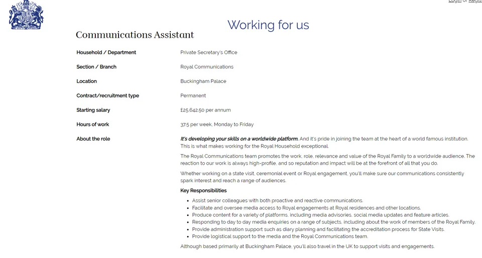 «Αναπτύξτε τις δεξιότητές σας σε μια παγκόσμια πλατφόρμα. Είναι υπερηφάνεια να συμμετέχετε στην ομάδα, στην καρδιά ενός παγκοσμίου φήμης ιδρύματος. Αυτό είναι που κάνει την εργασία για το Royal Household εξαιρετική. Η ομάδα του Royal Communications προωθεί τη δουλειά, το ρόλο, τη συνάφεια και την αξία της Βασιλικής Οικογένειας σε ένα παγκόσμιο κοινό. Η αντίδραση στη δουλειά μας είναι πάντα υψηλού προφίλ, και έτσι η φήμη και ο αντίκτυπος θα είναι στην πρώτη γραμμή όσων κάνετε», δήλωσε το παλάτι για τη δουλειά.