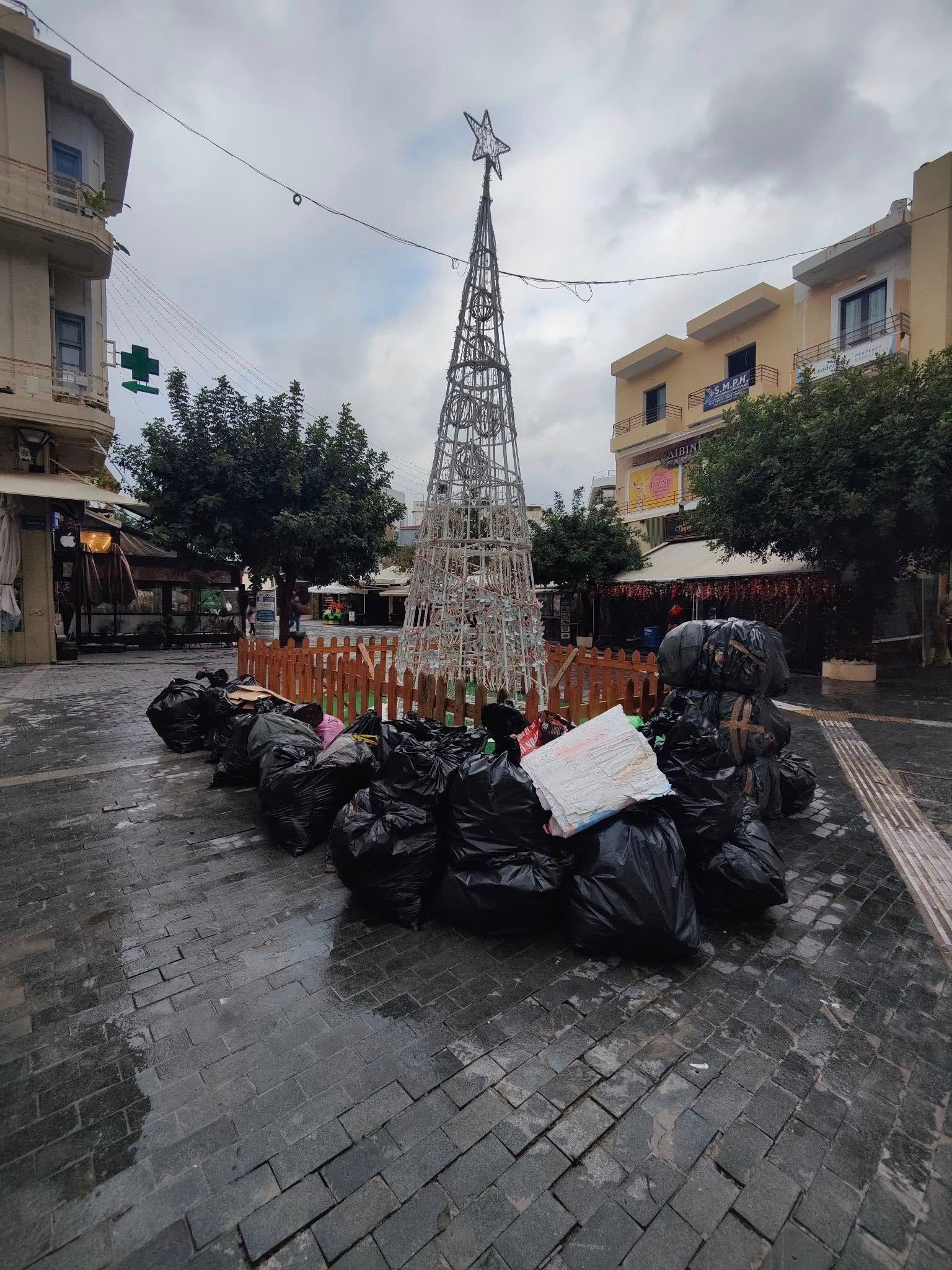 Σκουπίδια κάτω το Χριστουγεννιάτικο δέντρο, έξω ακριβώς από το Δημοτικό Μέγαρο Ηρακλείου, βρήκαν το πρωί πολίτες.