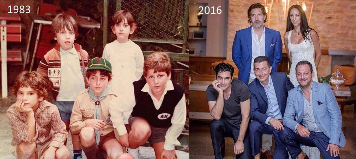 Συγκεκριμένα, στις δύο φωτογραφίες βλέπουμε τους δύο γιους του Μανόλη, Φίλιππο και Χριστόφορο μαζί με τρία από τα ξαδέρφια τους, τον Λευτέρη, την Μαρία και τον Γιάννη. Το 1983 και το… 2016, στην ίδια πόζα.