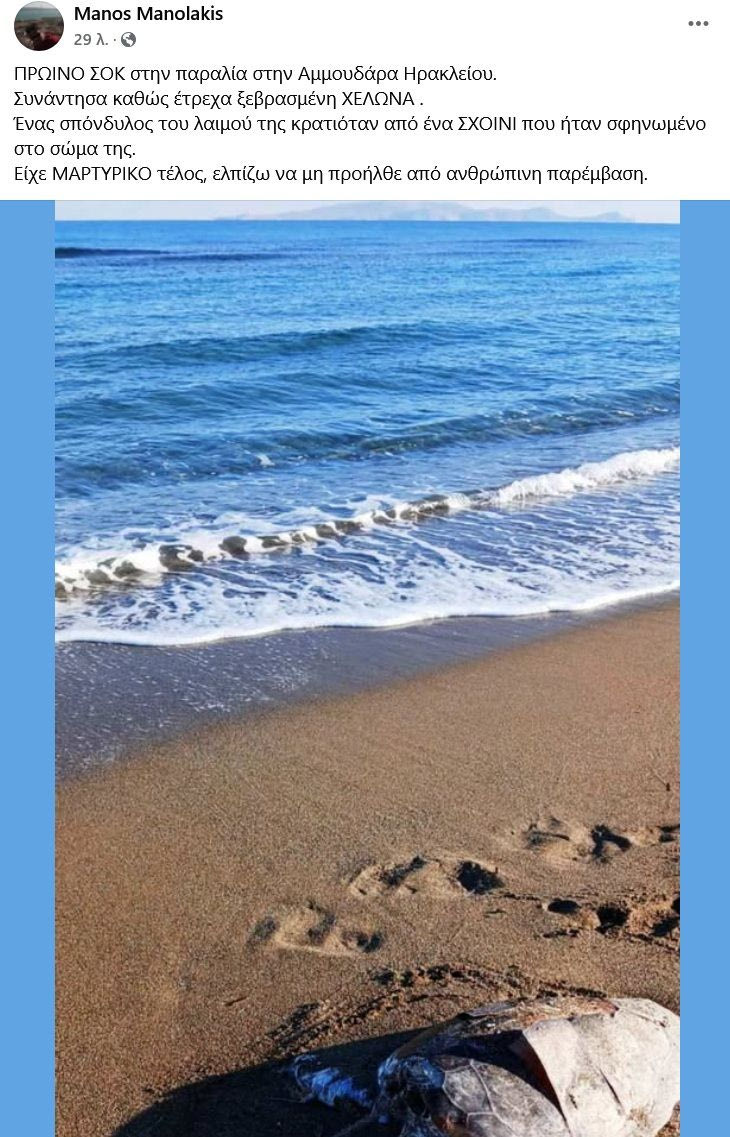 Χελώνα ξεβράστηκε νεκρή στην παραλία και μάλιστα σύμφωνα με αυτόπτες μάρτυρες είχε στο λαιμό της σχοινί.