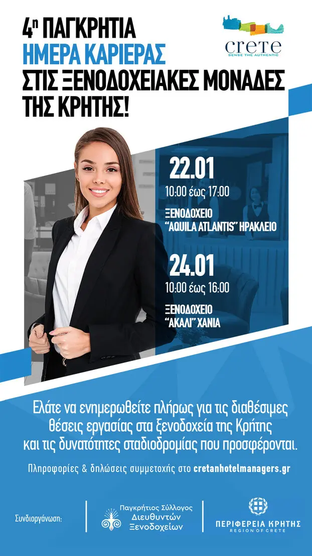 Επιπλέον, για όσους επιθυμούν να ξεκινήσουν την πρώτη τους επαγγελματική εμπειρία στον ξενοδοχειακό τομέα, θα παρέχεται αναλυτική πληροφόρηση και κατευθύνσεις για τα πρώτα τους βήματα στον κλάδο των ξενοδοχείων της Κρήτης.