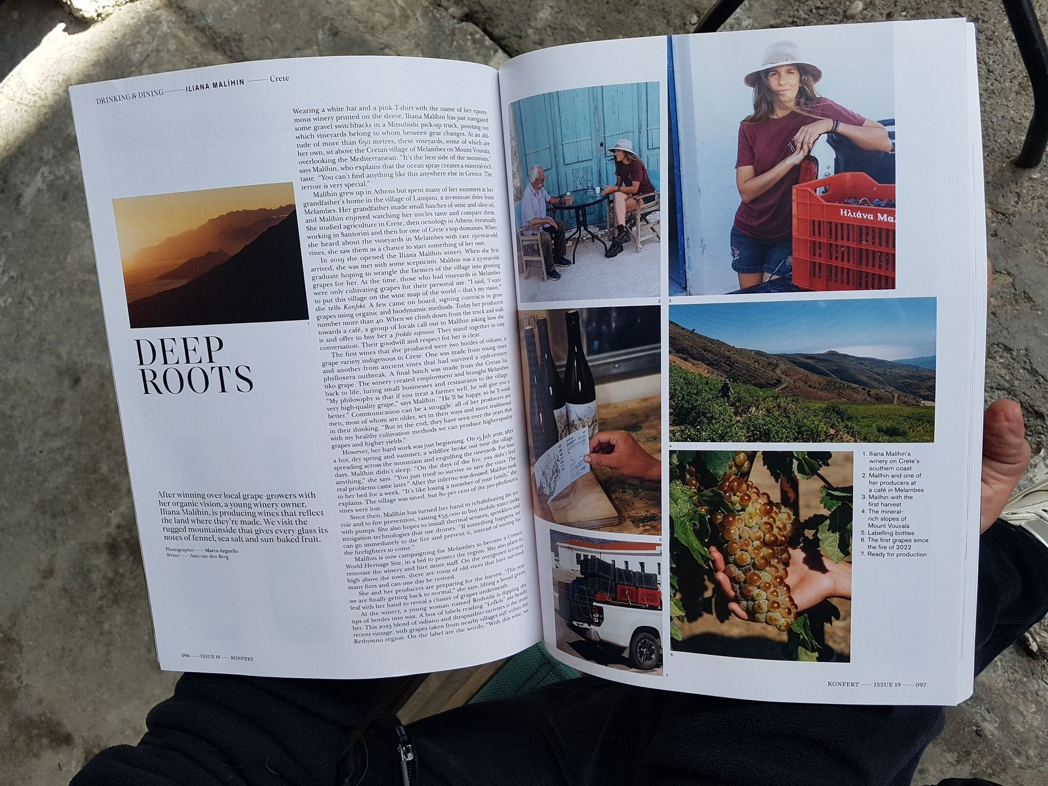 Το Konfekt –περιοδικό υψηλού κύρους για sharp dressing, design, ταξίδια και σύγχρονη κουλτούρα– παρουσιάζει την ιστορία μιας νέας γυναίκας που επέλεξε να επιστρέψει στον τόπο της και να επενδύσει στο μέλλον του. Η Ηλιάνα, όπως περιγράφεται και στο δημοσίευμα, κατάφερε να ενώσει τη γη, τους ανθρώπους και το κρασί του Ρεθύμνου σε ένα ενιαίο όραμα: τη δημιουργία κρασιών με σεβασμό στην παράδοση, το τοπίο και τους παλαιούς τρόπους του αμπελιού.