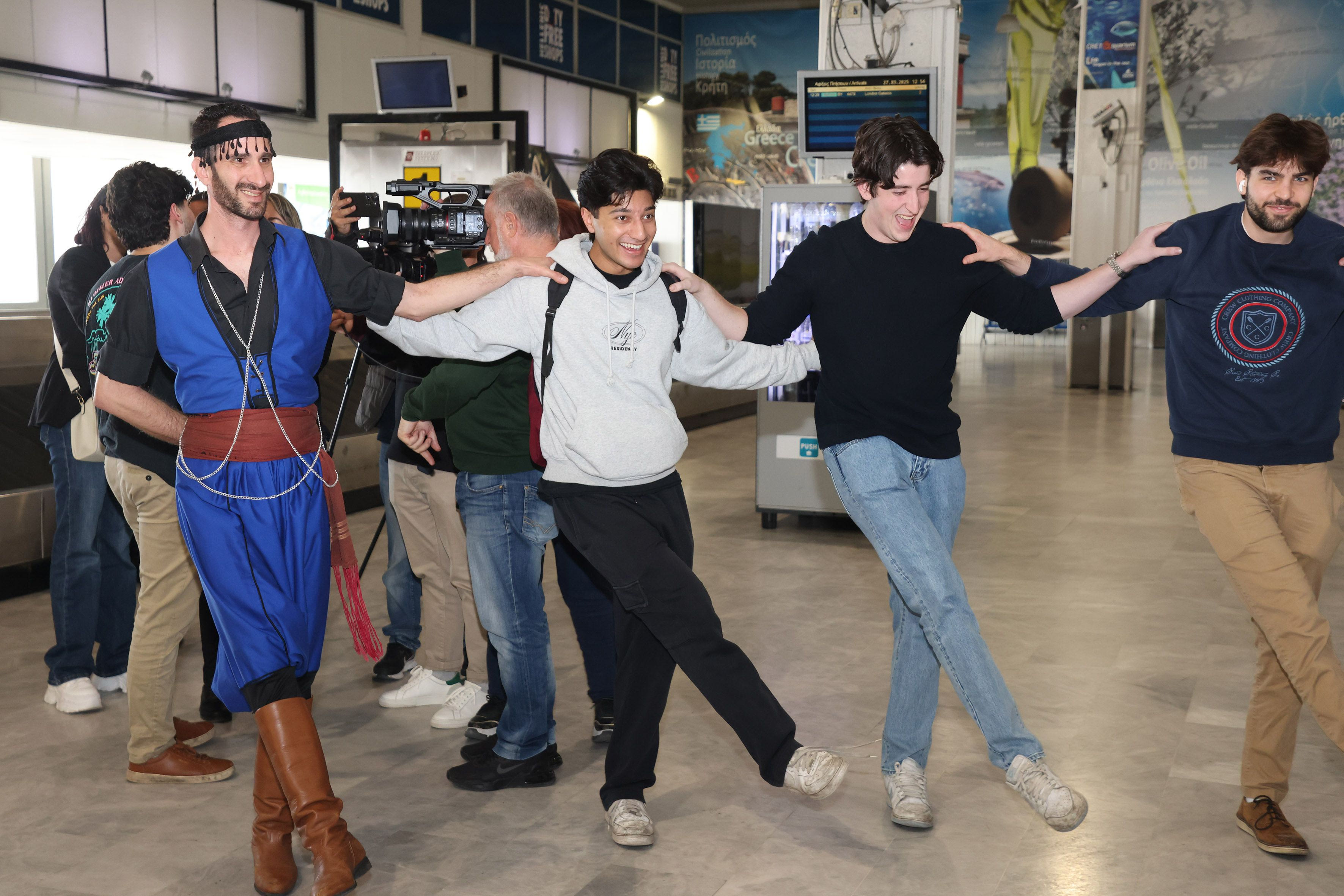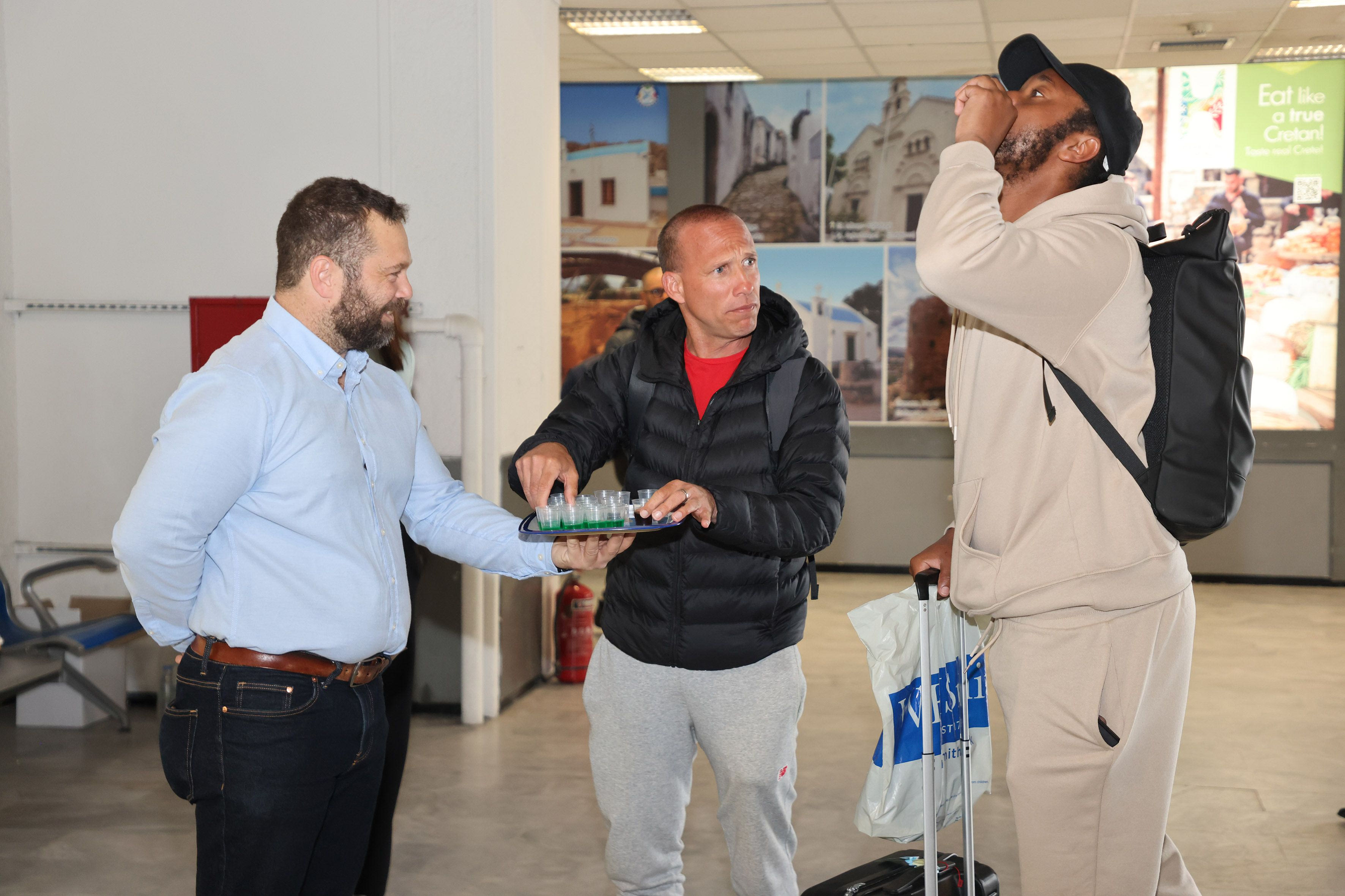 Οι επιβάτες από το Λονδίνο γεύτηκαν τις παραδοσιακές λιχουδιές, ενώ δεν ήταν λίγοι εκείνοι που επιχείρησαν να χορέψουν… κρητικά με το παραδοσιακό συγκρότημα.