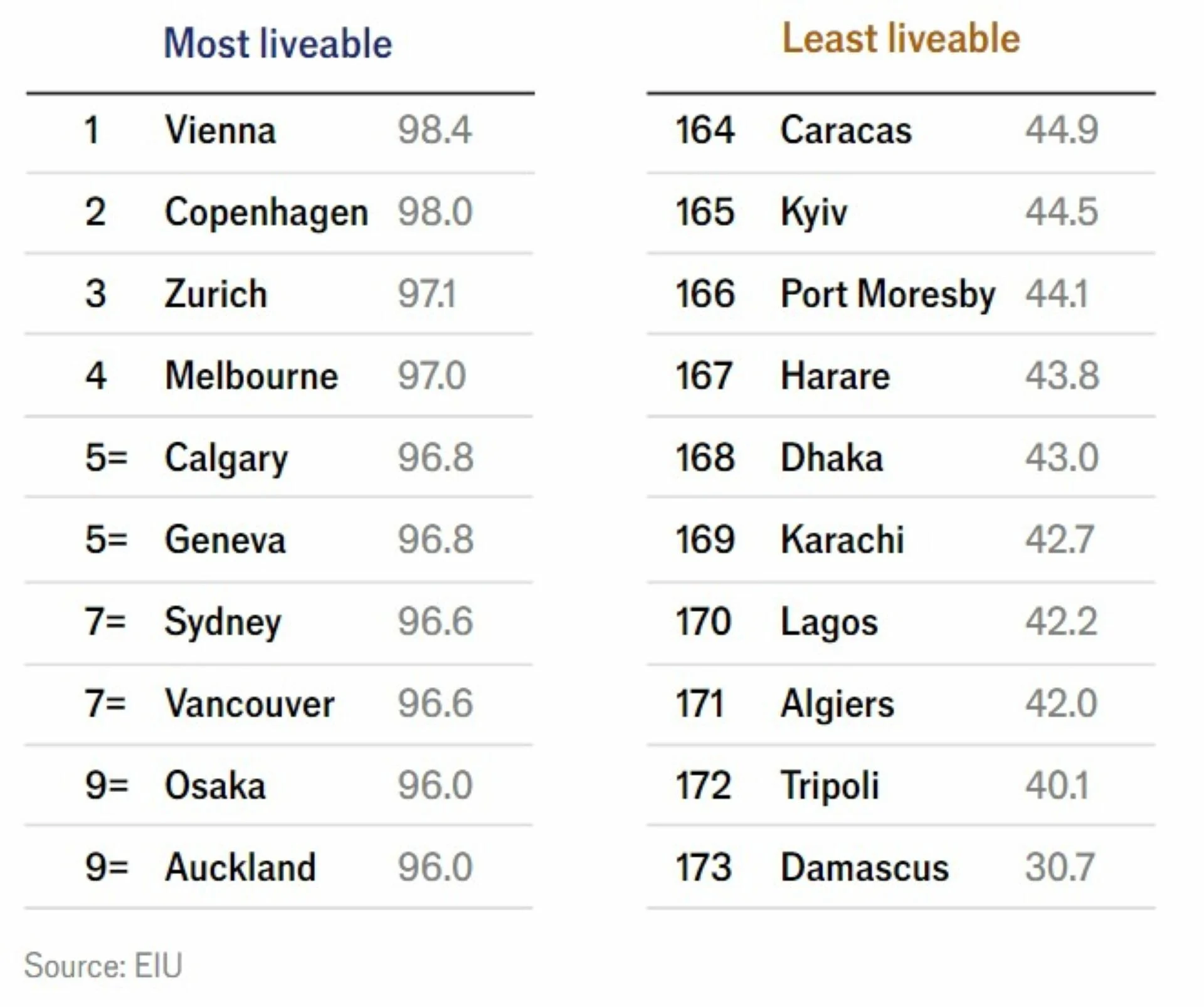 Η ετήσια έκθεση του Economist, η οποία έχει ως στόχο να δείξει πόσο άνετη ή βιώσιμη είναι μια πόλη, εξέτασε 173 πόλεις παγκοσμίως με βάση 30 δείκτες που οργανώνονται σε πέντε κατηγορίες: σταθερότητα, υγειονομική περίθαλψη, πολιτισμός και περιβάλλον, εκπαίδευση και υποδομές.