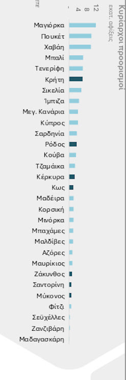 Σύμφωνα με την μελέτη της Διεύθυνσης Οικονομικής Ανάλυσης της Τράπεζας, όπως σημειώνει το Traveldailynews, τα ελληνικά νησιά αντιπροσωπεύουν 11% του παγκόσμιου νησιωτικού τουρισμού, με επτά εξ αυτών να κατατάσσονται στους 30 κορυφαίους προορισμούς διεθνώς, δίπλα σε νησιά όπως το Μπαλί και η Χαβάη.
