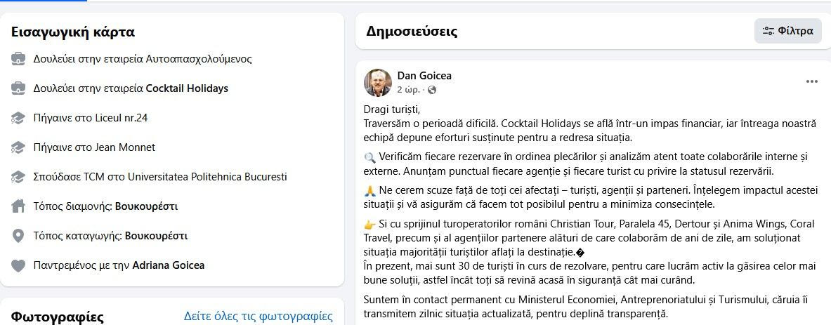 Σε μήνυμά του ο εκ των ιδιοκτητών του Cocτail Holidays Dan Goicea, αναφέρει: