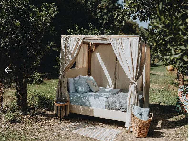 Προσφέρεται επίσης πάπλωμα σε περίπτωση ψύχρας. Παράλληλα, γύρω και πάνω από το κρεβάτι υπάρχουν κουρτίνες και “οροφή” που λειτουργούν συμπληρωματικά για την ιδιωτικότητα και για τις δροσερές νύχτες. Ο εξοπλισμός μας, τόσο το κρεβάτι όσο και οι κουρτίνες είναι ειδικά σχεδιασμένες από αδιάβροχο υλικό.